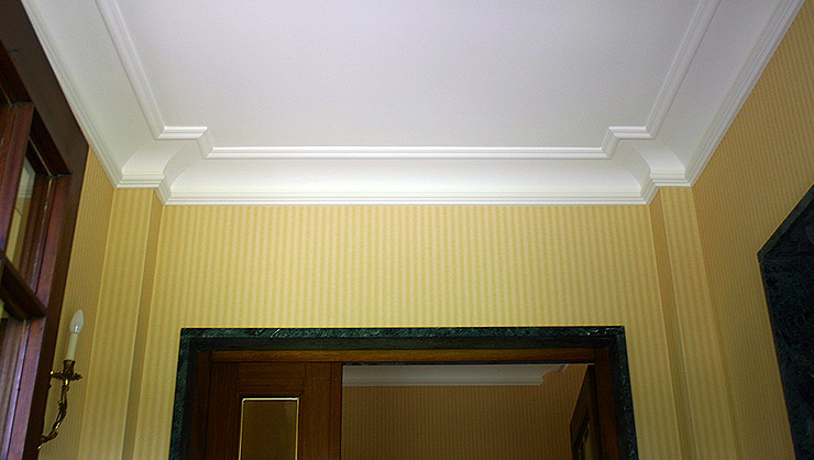 Die Stuckprofile an den seitlichen Wandvorsprüngen im Entree prägen das Raumerlebnis