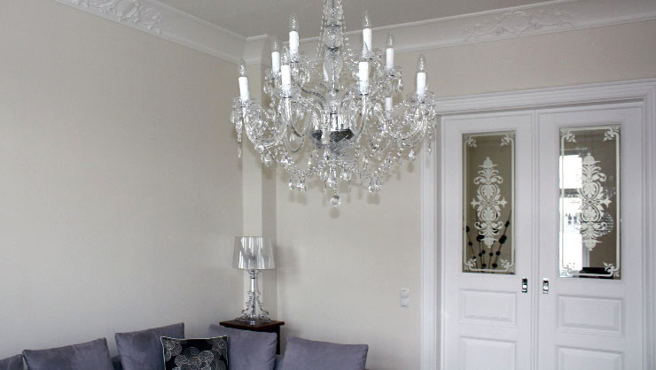 Wohnzimmer mit subtil weiß gehaltenem Leimfarbenanstrich im Bereich der Decke und des Stucks