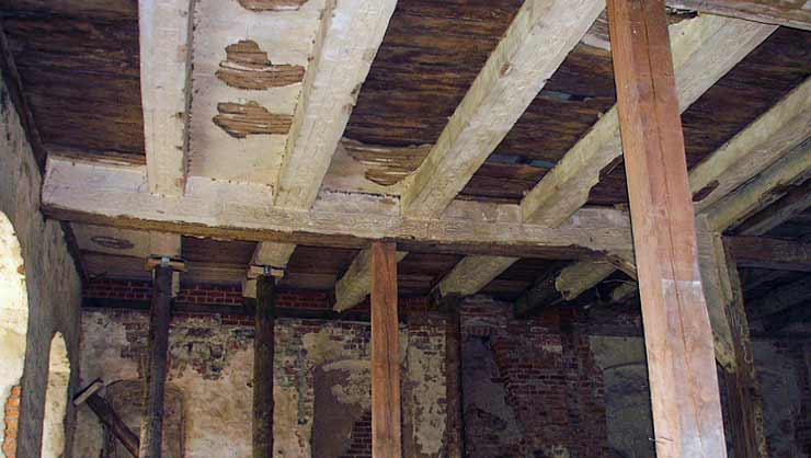Pressstuckdecke vor der Restaurierung mit provisorischer Absteifung