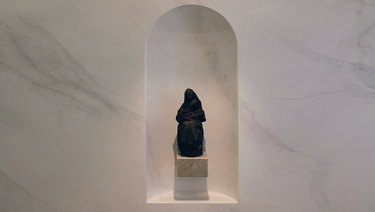 Konche mit neu geschaffener Skulptur in händisch marmorierter und polierter Stuccolustroarbeit