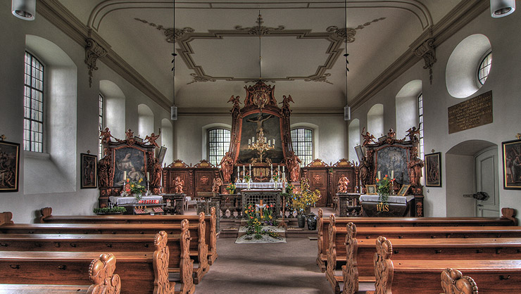 Innenansicht mit Hoch-, Marien- und Kranzaltar