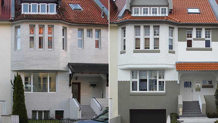 Ansicht vor und nach der rekonstruierten Fassadengestaltung