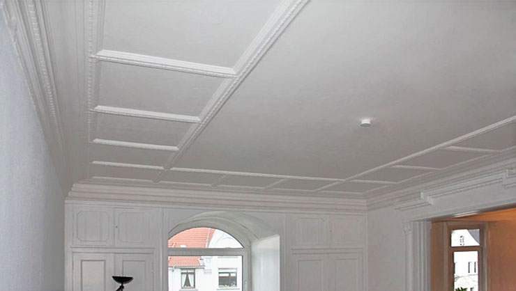 Restaurierte Kassettenstuckdecke nach erfolgreicher Hausschwammsanierung
