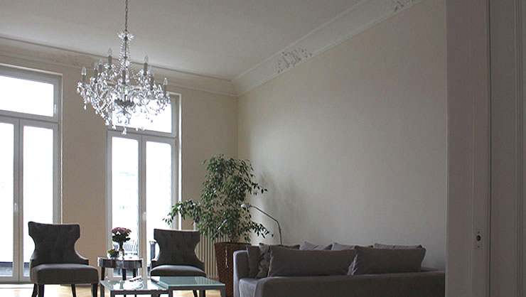 Gestaltung einer Stadtwohnung – Wohnzimmer mit Stuckdecke und ausgeführten Malerarbeiten