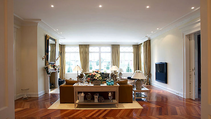 Wohnzimmer mit individuellem Stuckprofil in enger Absprache mit den Auftraggebern